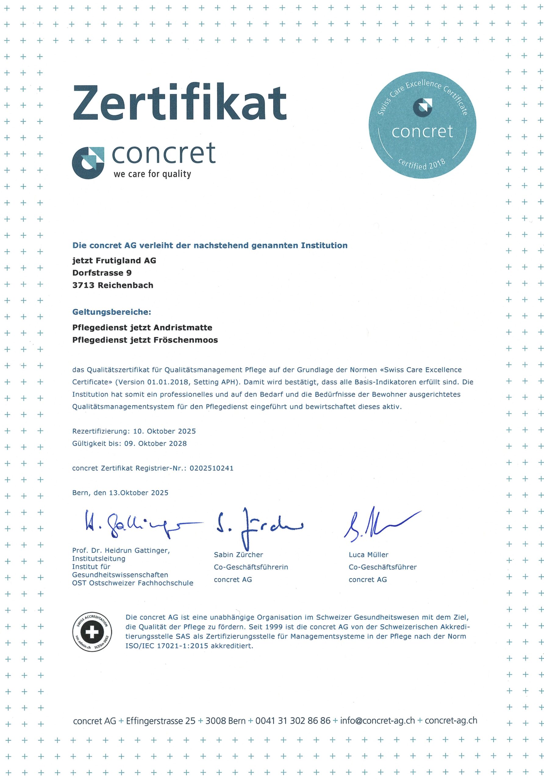 Unsere Pflege ist ausgezeichnet mit dem Swiss Care Excellence Certificate.
